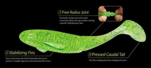 Dessutom förbättrar den mjuka böjningen vid leden vattenmotståndet, vilket bidrar till en högre krokfångstfrekvens. Med sin betesfiskliknande form, ribbor som ger ett måttligt vattenbett, övre och nedre skåror konstruerade för att öka krokningseffektiviteten, samt fenor som hjälper till att dämpa kroppens vaggande rörelse, är denna innovativa shad tail worm fylld med en mängd funktioner som lockar till hugg.