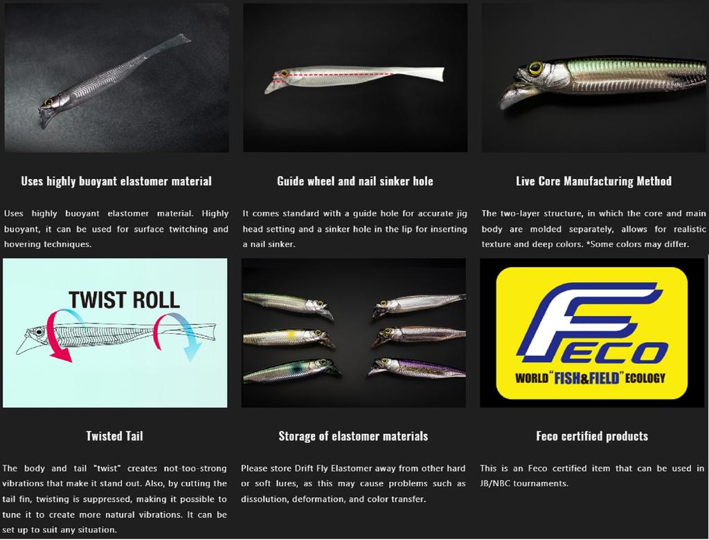 Jackall designade den innovativa Driftfry specifikt för mid-strolling och hover-strolling-tekniker. Den integrerade läppdesignen använder vattenmotstånd tillsammans med lätta ryck från fiskarens spötopp under invevningen för att ge en "twist-roll" blinkande rörelse som lockar till sig aggressiva hugg från motvillig bass. Driftfry har två styrhål: ett för att säkerställa perfekt jigghuvudjustering och ett annat på läppen för att ange rätt plats för insättning av nagelvikt vid hover-strolling. Jackalls Live-Core dubbel-lager konstruktion ger djup, realistisk textur och mycket livfulla färger. Med bevisad framgång inom japansk sportfiske är Driftfry det "självklara" alternativet vid användning av mid-strolling eller hover-strolling-tekniker.